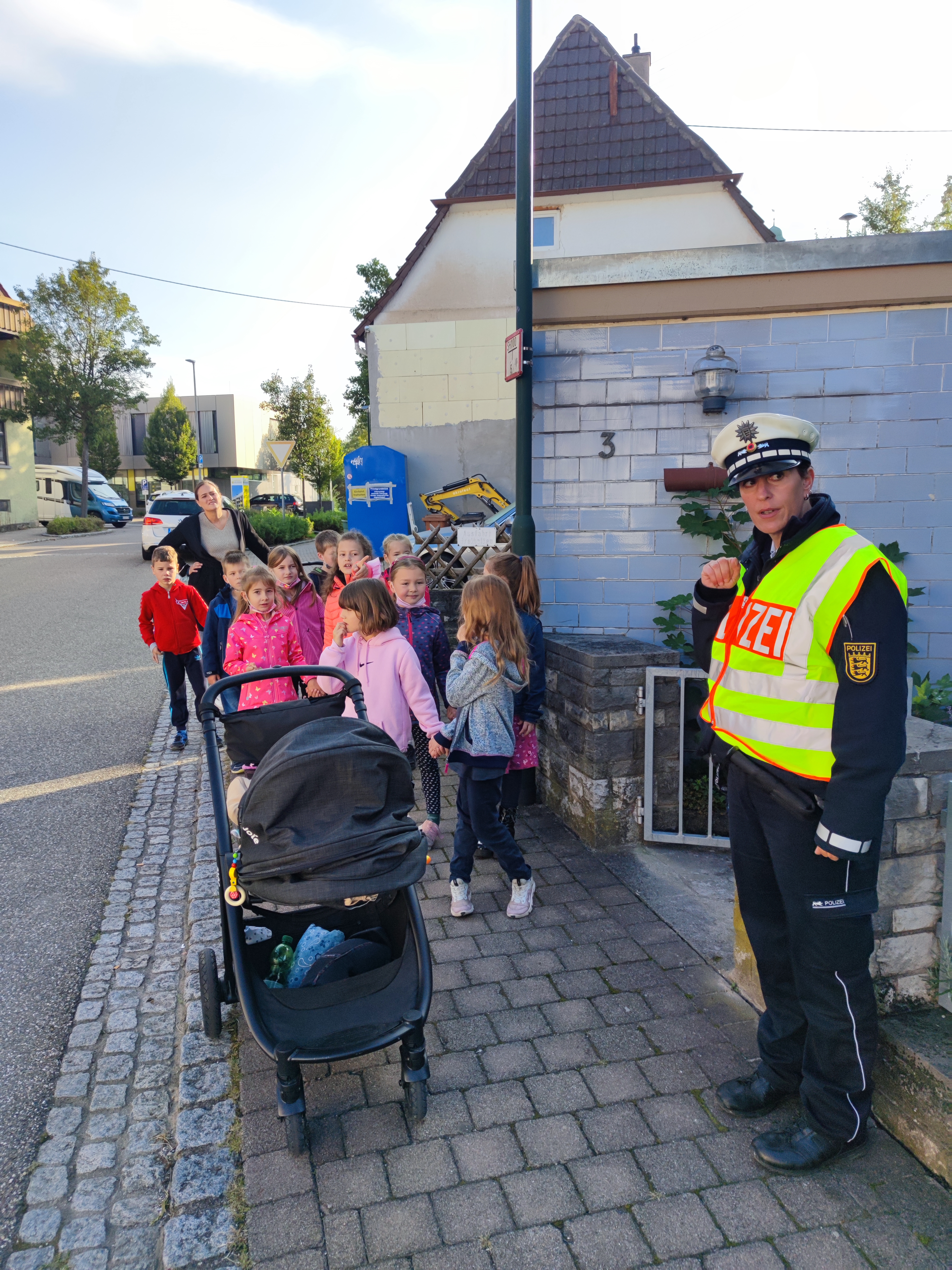 Im Zentrum der Übungen stand die sichere Überquerung von Straßen. In diesem Zusammenhang lernten die Kinder u.a. die korrekte Benutzung eines Zebrastreifens, dass auch Gefahren von geparkten Autos ausgehen können und worauf bei schwer einsichtigen Kreuzungen zu achten ist. Für einige Kinder war es z.B. neu, dass am Zebrastreifen zunächst die Hand gehoben werden soll um zu zeigen, dass man die Straße überqueren will. Danach schaut man nach rechts und links um sich einen Überblick über den Verkehr zu verschaffen. Es darf erst die Straße überquert werden, wenn alle Autos angehalten haben oder die Straße frei ist. Die Kinder lernten zudem, dass sie beim Entlanglaufen auf Gehwegen auch auf Garageneinfahrten achten müssen, ob da vielleicht ein Auto herausfahren will. Steht dort ein geparktes Auto ist es wichtig die Rückleuchten zu beobachten. Geht ein weißes Licht an, bedeutet dies, dass ein Auto den Rückwärtsgang eingelegt hat und womöglich losfahren möchte.