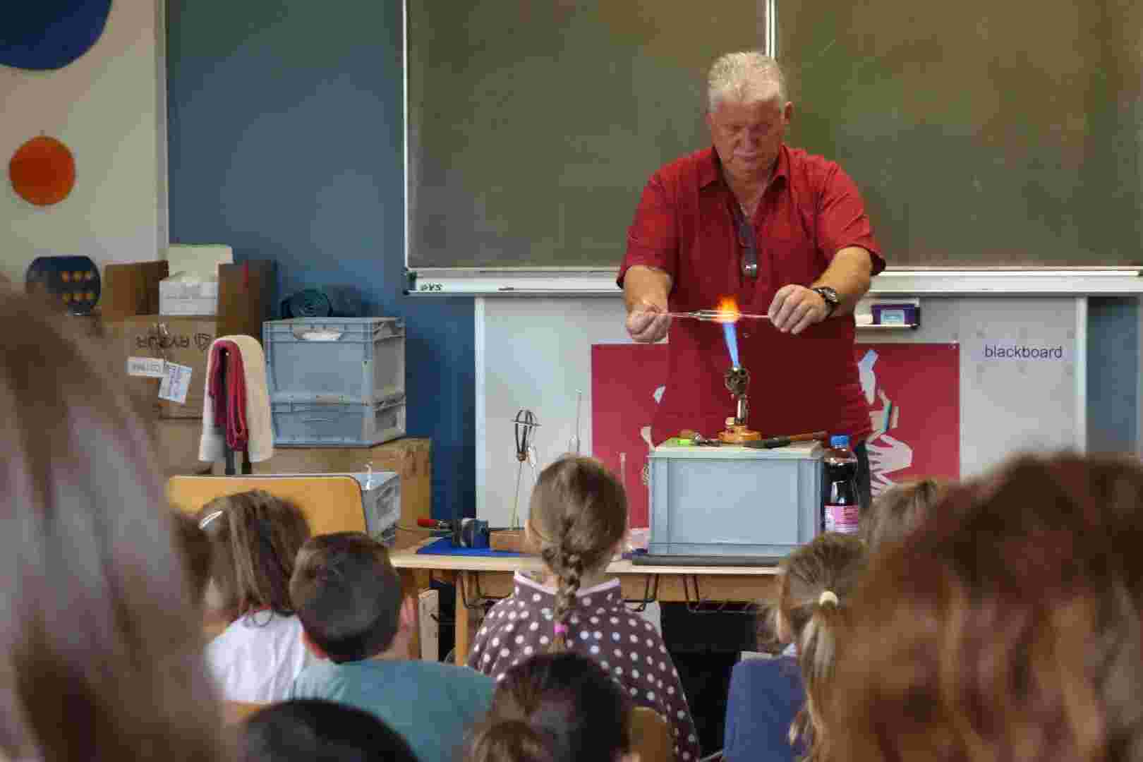 Besuch aus dem fränkischen Coburg hatte sich angesagt: Herr Sinne, ein alter Bekannter, hat uns am 10. Mai besucht und den Kindern der AHGS die Kunst der Glasbläserei näher gebracht. Im Musiksaal hat er eine kleine Werkstatt aufgebaut und in 2 Vorführungen, eine für die Klassen 1 und 4 und eine für die Klassen 2 und 3, hat er uns gezeigt, wie aus einem Rohling eine Kugel, eine Blumenvase, ein Schwan oder auch eine versilberte Gitarre entsteht.