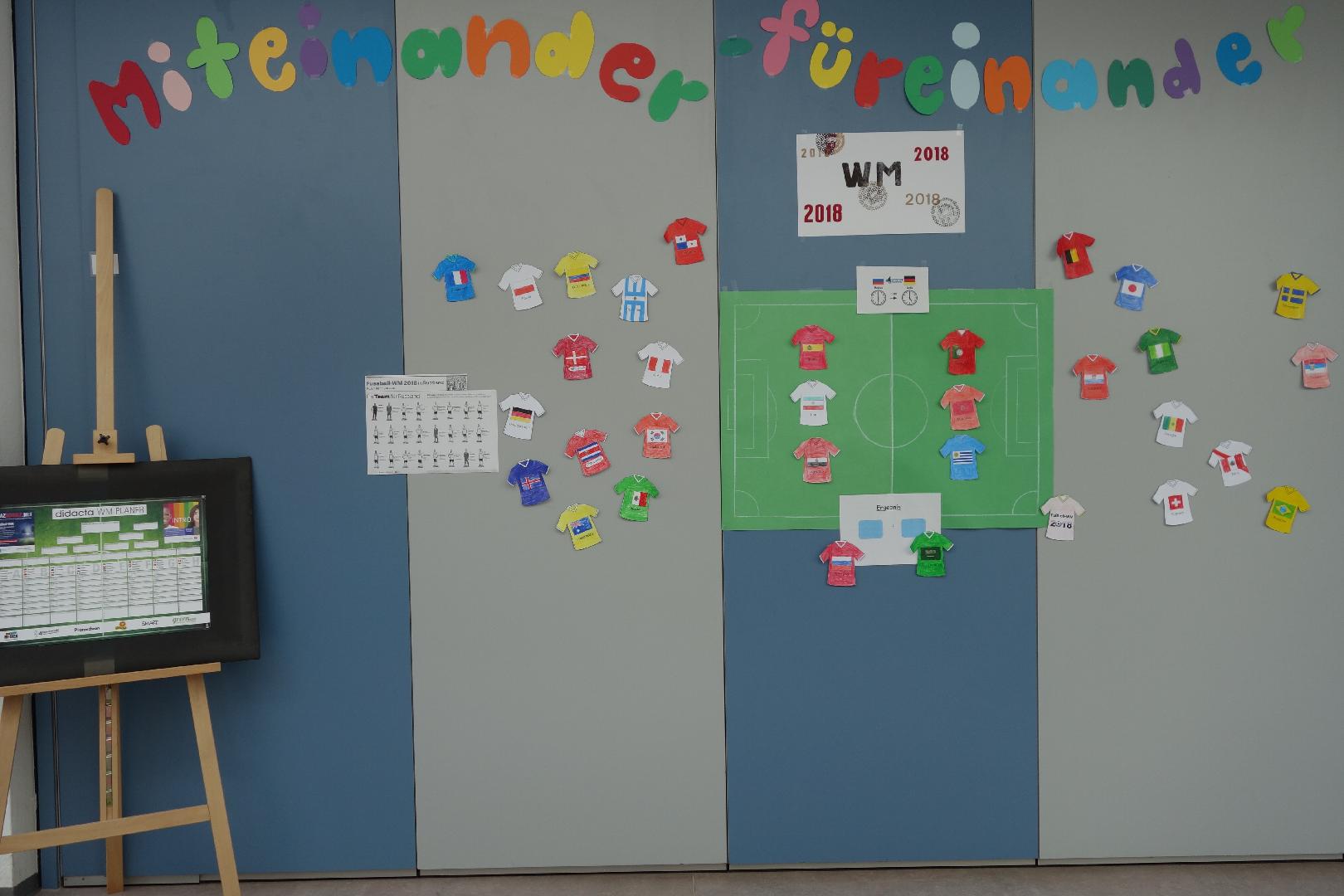 Die Fußball-WM 2018 kann kommen, wir sind bereit! Die Klasse 3a hat mit ihren Lehrerinnen Frau Armbrust und Frau Hartje fleißig Trikots von allen teilnehmenden Nationen gemalt, ein Fußballfeld gezeichnet und mit all diesen Dingen die Wand im Foyer der Schule bestückt. So können wir immer sehen, wer spielt und am nächsten Tag erfahren wir das Ergebnis.