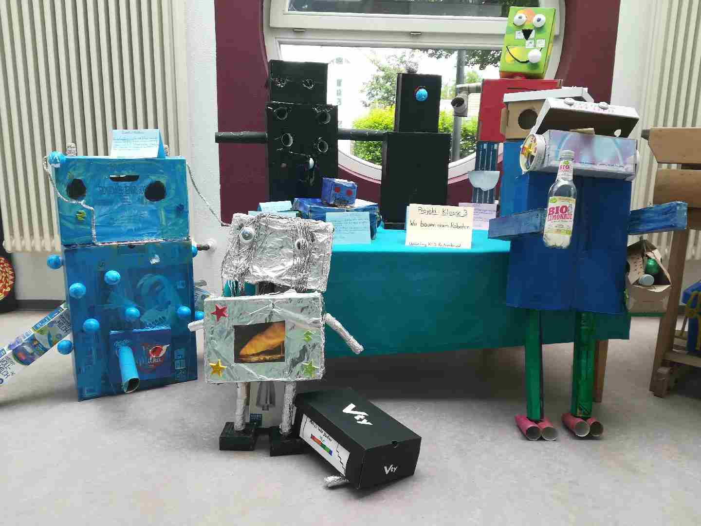 Im Homeschooling verknüpfte Klassenlehrerin Dagmar Armbrust die Mathematik mit der Kunst. Aus verschiedenen Formen zeichnete die Klasse 3 der Albert-Hirth Grundschule Roboter und malte sie aus. Anschließend erhielten alle Kinder den Auftrag Dosen, Karton, Rollen … zu sammeln und diese sobald der Präsenzunterricht startet mitzubringen.